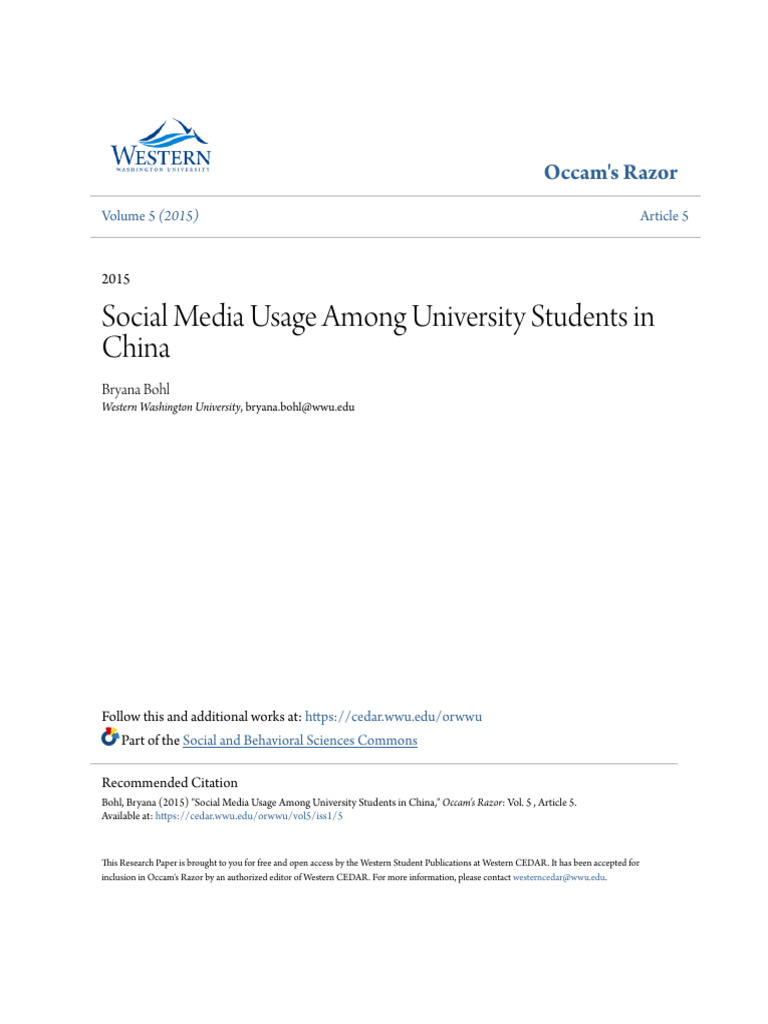Bohl, Bryana (2015) "Social Media Usage Among University Students in China," Occam's Razor: Vol. 5 , Article 5.
