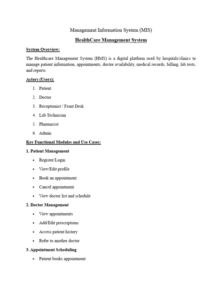 The Healthcare Management System (HMS) is a digital platform used by hospitals/clinics to