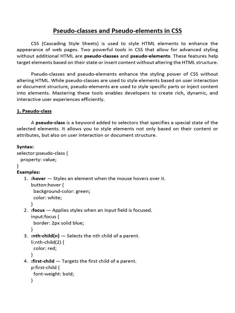 altering HTML. While pseudo-classes are used to style elements based on user interaction