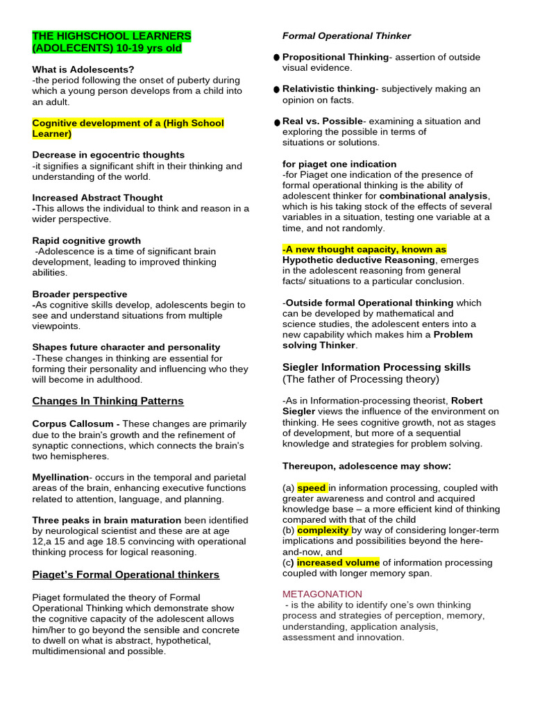 THE HIGHSCHOOL LEARNERS Formal Operational Thinker