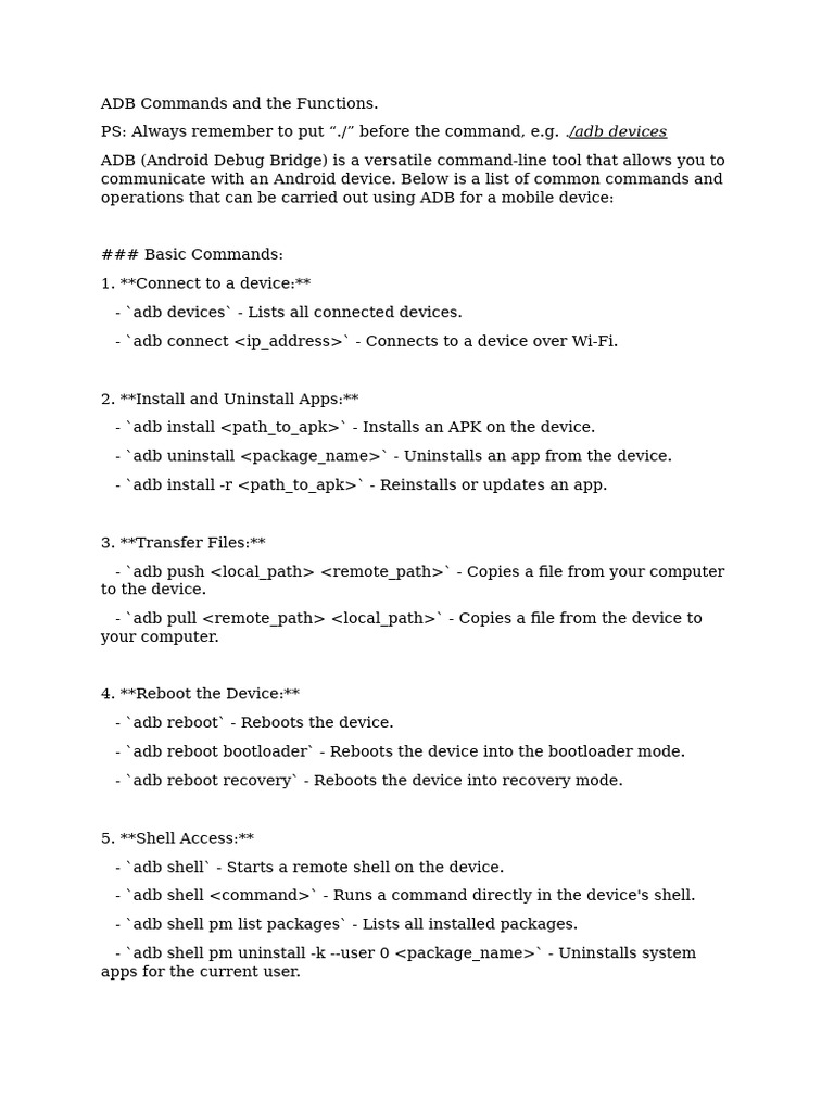 - `adb uninstall <package_name>` - Uninstalls an app from the device.