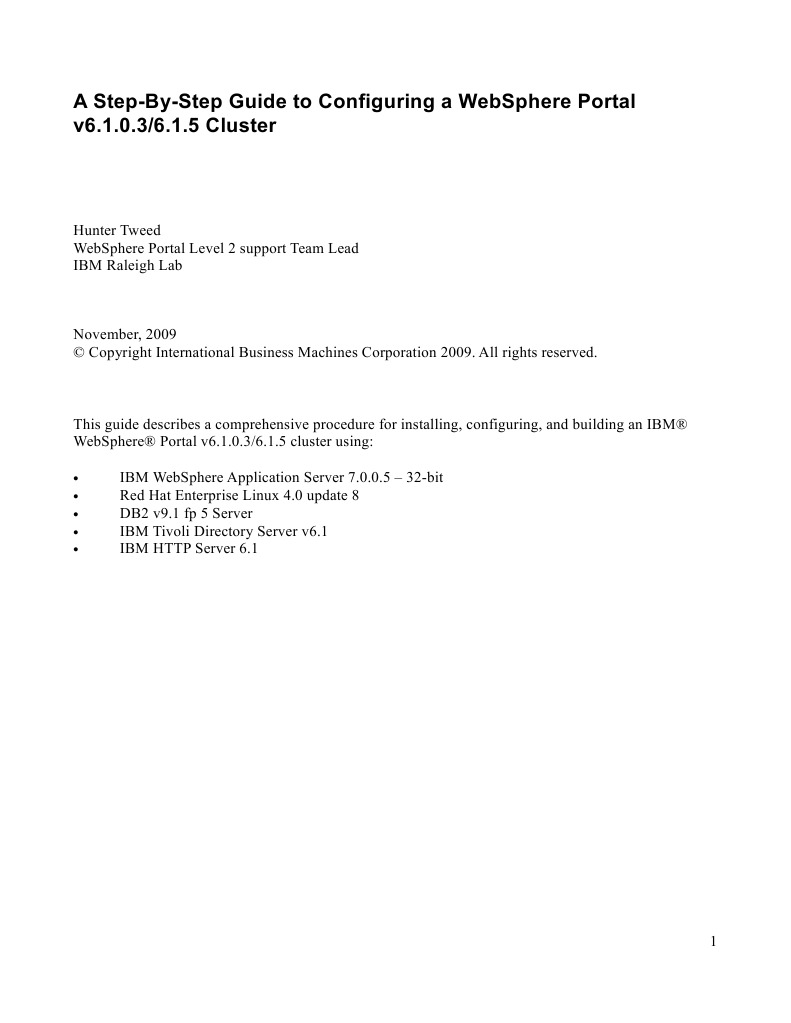 This guide describes a comprehensive procedure for installing, configuring, and building an IBM WebSphere Portal v6.1.0.3/6.1.5 cluster using:
