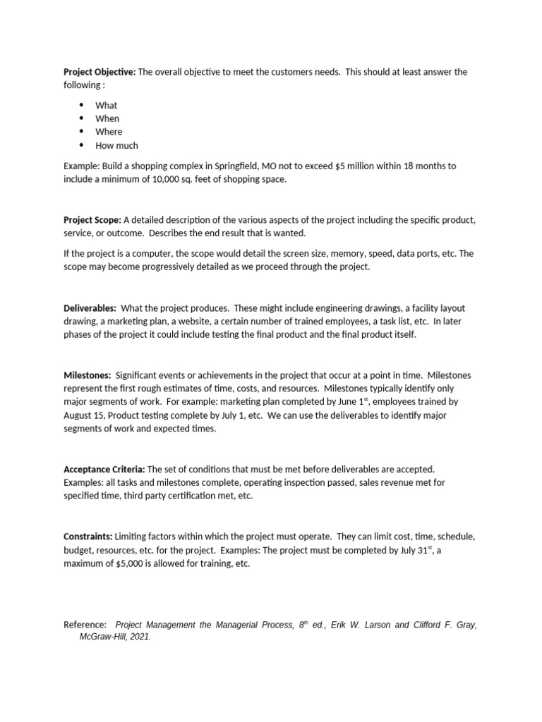 Reference: Project Management the Managerial Process, 8th ed., Erik W. Larson and Clifford F. Gray,
