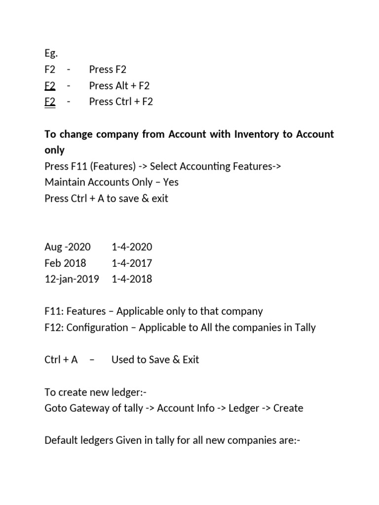 Alt + C – To create new ledger, stock item ect. at the time of passing voucher entry.