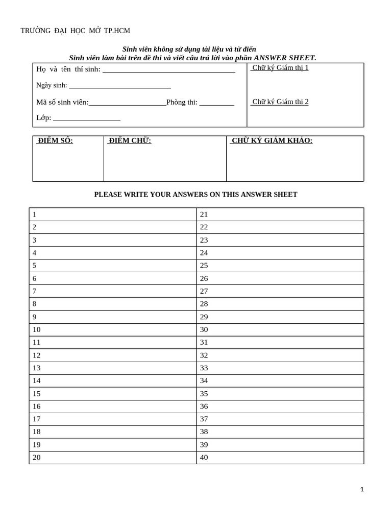 Sinh viên làm bài trên đề thi và viết câu trả lời vào phần ANSWER SHEET.