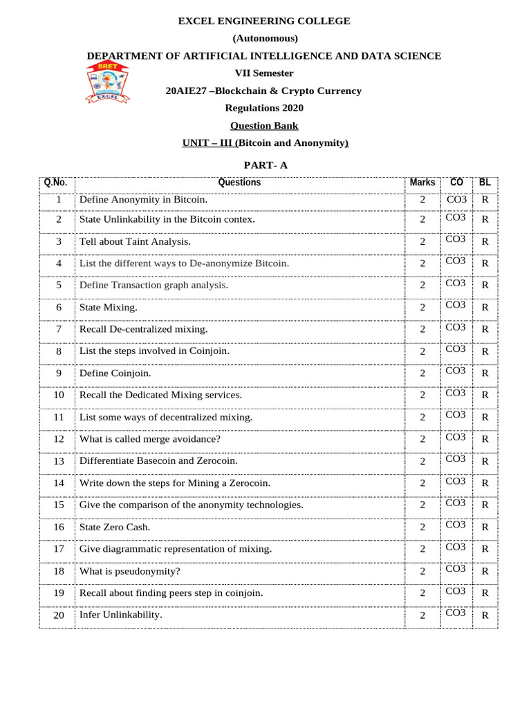 1 Define Anonymity in Bitcoin. 2 CO3 R