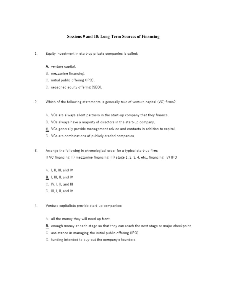 I) VC financing; II) mezzanine financing; III) stage 1, 2, 3, 4, etc., financing; IV) IPO