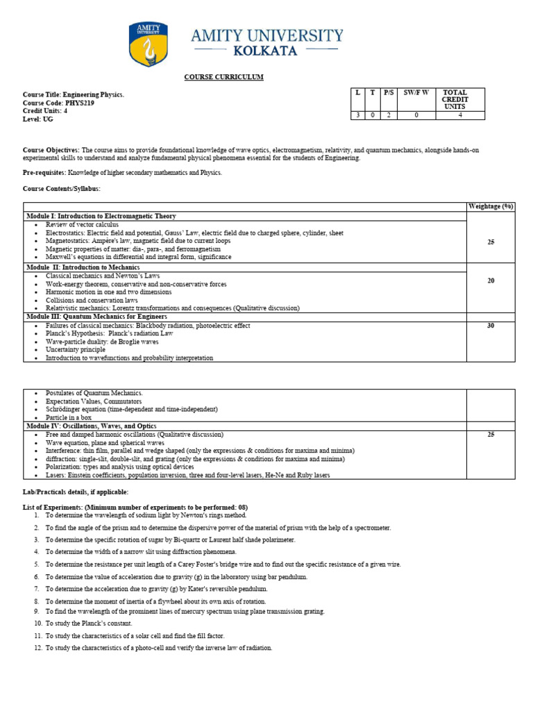Course Objectives: The course aims to provide foundational knowledge of wave optics, electromagnetism, relativity, and quantum mechanics, alongside hands-on