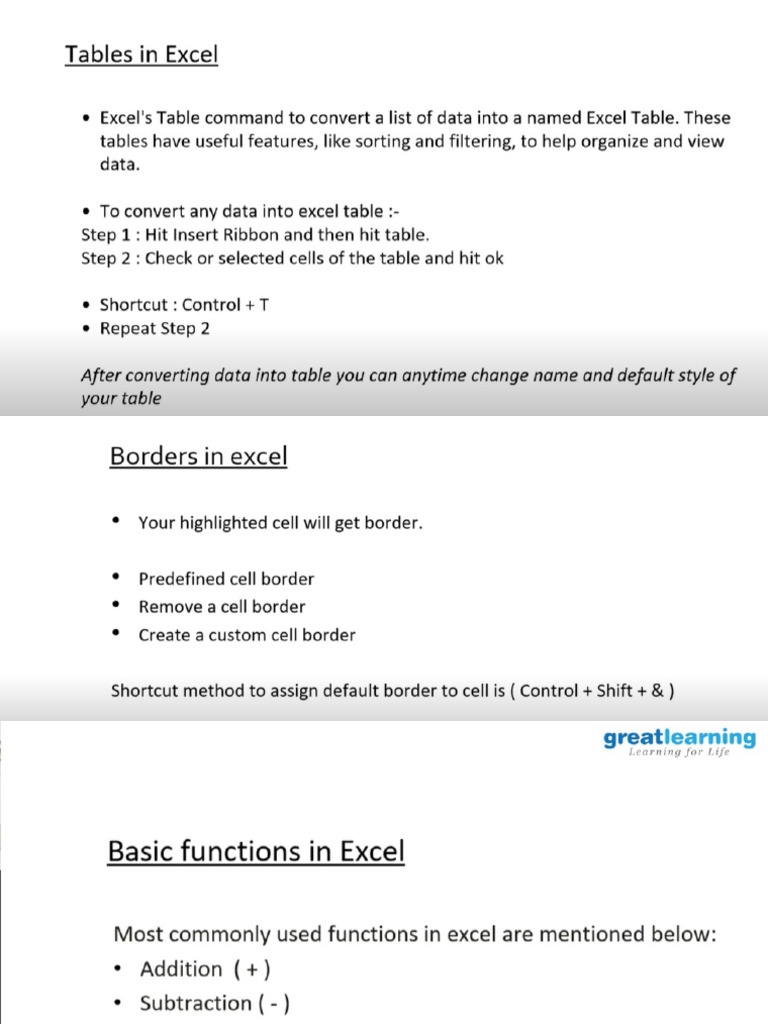 Shortcut method to assign default border to cell is ( Control + Shift + & )Most commonly used functions in excel are mentioned below: