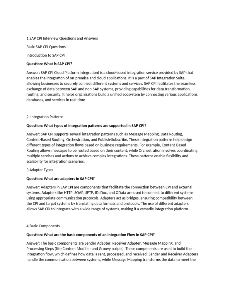 Answer: SAP CPI supports various message protocols, such as HTTP, HTTPS, JMS, FTP, SFTP, and