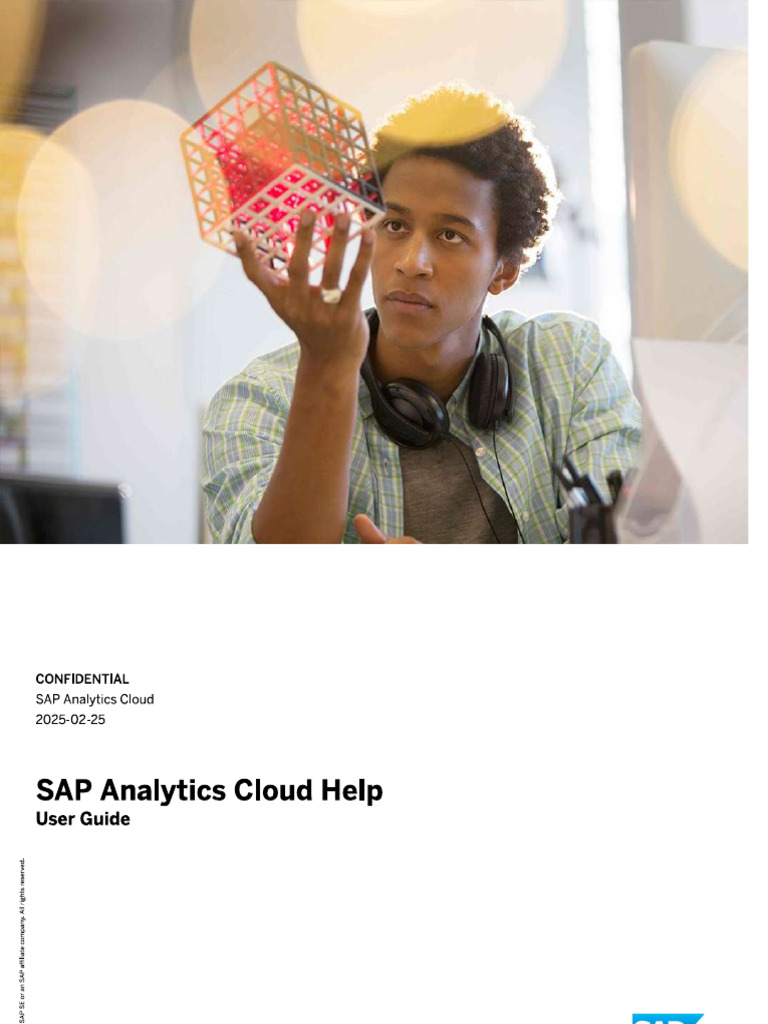 The document is a user guide for SAP Analytics Cloud, detailing various features and functionalities available to users. It covers topics such as getting started, navigating the platform, personalizing experiences, data connections, and data preparation. The guide also includes sections on sharing and collaborating on content, as well as troubleshooting and exporting data.