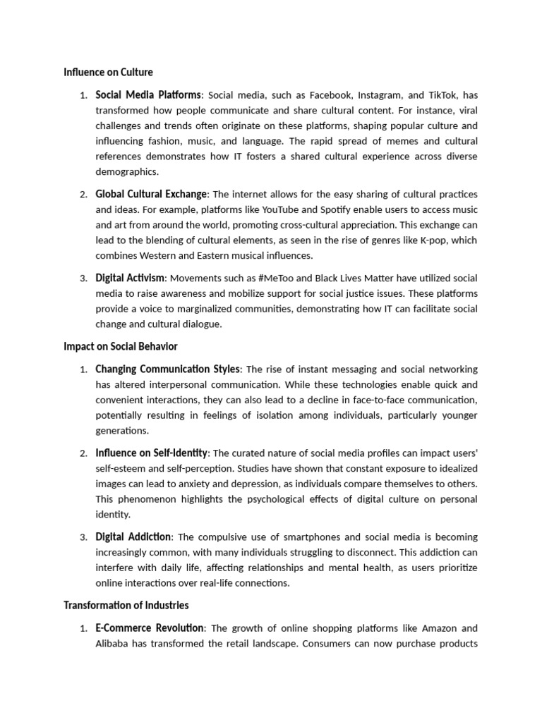In conclusion, Information Technology profoundly influences culture, social behavior, and