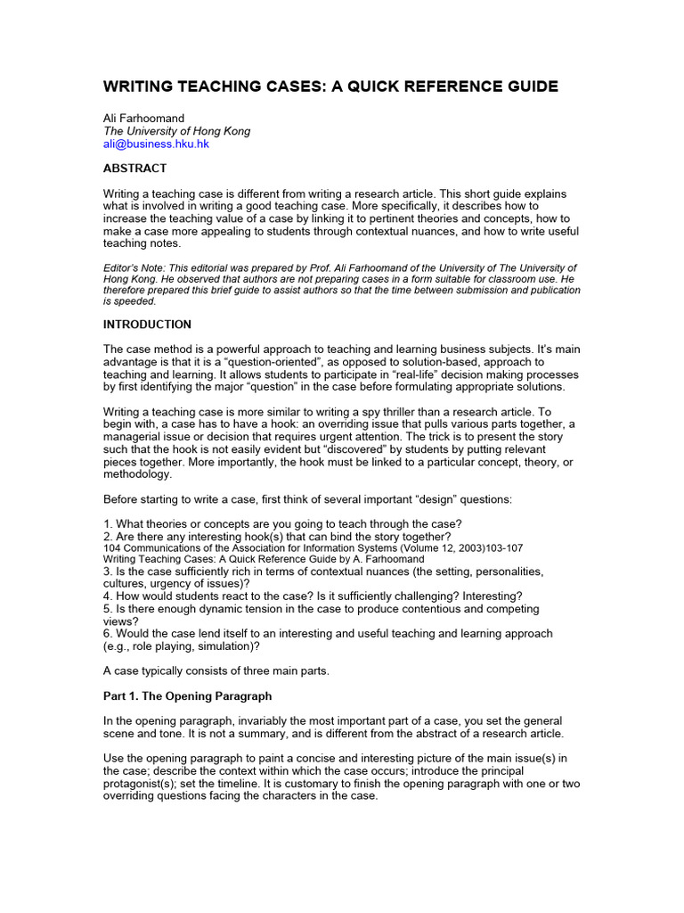 what is involved in writing a good teaching case. More specifically, it describes how to