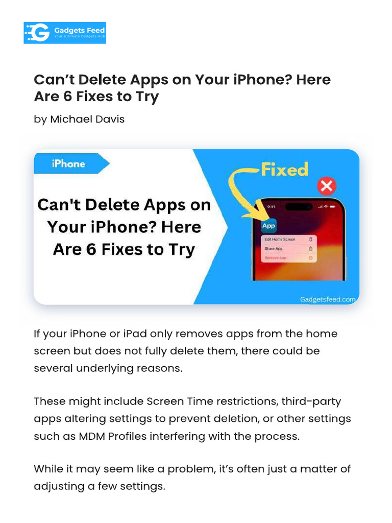 The document provides a guide on how to troubleshoot issues with deleting apps on iPhones and iPads, highlighting potential reasons such as Screen Time restrictions, third-party apps, and Mobile Device Management (MDM) profiles. It outlines step-by-step solutions to adjust settings and remove restrictions that may prevent app deletion. If these solutions do not resolve the issue, it suggests contacting Apple Support for further assistance.
