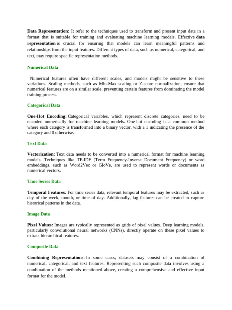 Data Representation: It refer to the techniques used to transform and present input data in a