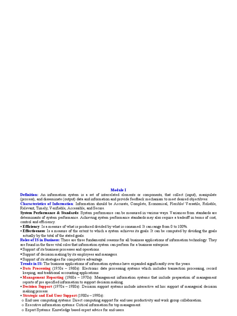 (output) data and information and provide feedback mechanism to meet desired objectibves. Characteristics of Information: Information should be Accurate, Complete, Economical, Flexible/ Versatile, Reliable, Relevant, Timely, Verifiable, Accessible, and Secure. System Performance & Standards: System performance can be measured in various ways. Variances from standards are determinants of system performance. Achieving system performance standards may also require a tradeoff in terms of cost, control and efficiency. Efficiency: Is a measure of what is produced divided by what is consumed. It can range from 0 to 100%. Effectiveness: Is a measure of the extent to which a system achieves its goals. It can be computed by dividing the goals actually by the total of the stated goals. Roles of IS in Business: There are three fundamental reasons for all business applications of information technology. They are found in the three vital roles that information system can perform for a business enterprise. Support of its business processes and operations. Support of decision making by its employees and managers. Support of its strategies for competitive advantage. Trends in IS: The business applications of information systems have expanded significantly over the years. Data Processing (1950s 1960s): Electronic data processing systems which includes transaction processing, record keeping, and traditional accounting applications. Management Reporting (1960s 1970s): Management information systems that include preparation of management reports of pre specified information to support decision making. Decision Support (1970s 1980s): Decision support systems include interactive ad hoc support of managerial decision making process. Strategic and End User Support (1980s 1990s): o End user computing systems: Direct computing support for end user productivity and work group collaboration. o Executive information systems: Critical information for top management. o Expert Systems: Knowledge based expert advice for end users.