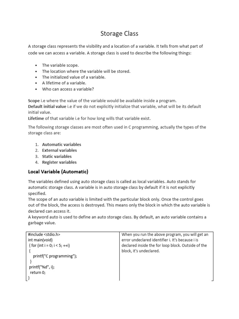 A storage class represents the visibility and a location of a variable. It tells from what part of