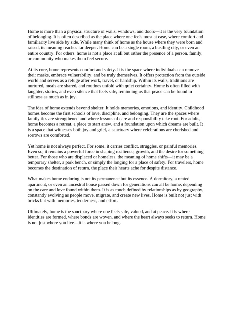 Ultimately, home is the sanctuary where one feels safe, valued, and at peace. It is where