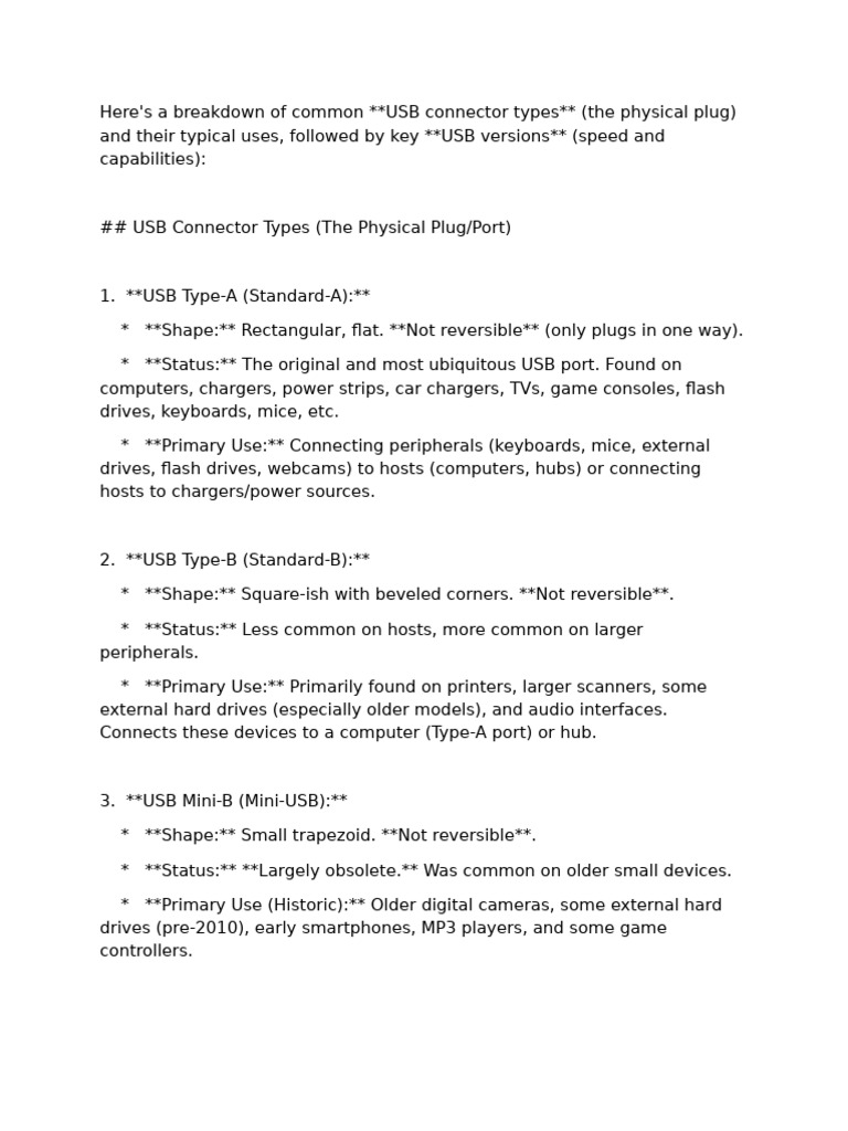 * **Use:** Basic peripherals (keyboards, mice, older printers), charging
