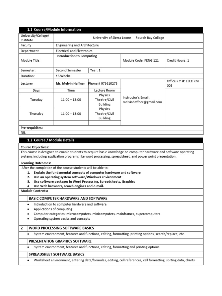 Lecturer Mr. Melvin Haffner Phone # 076610279