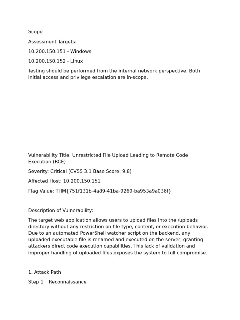 Testing revealed that the /uploads endpoint accepted files without any proper