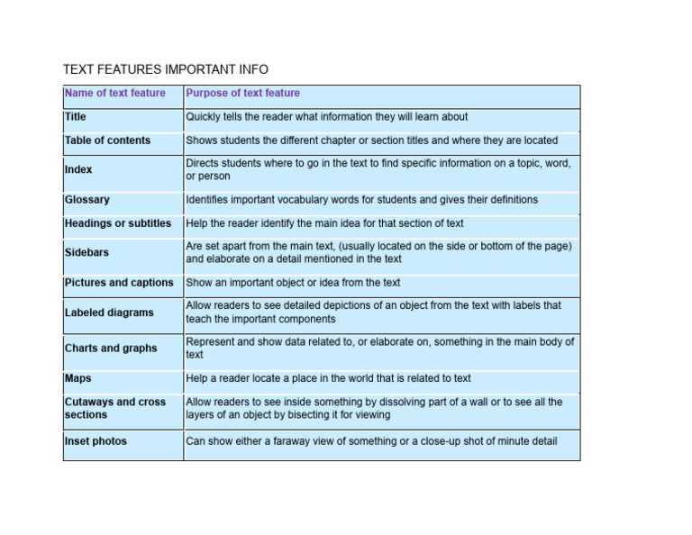 Name of text feature Purpose of text feature
