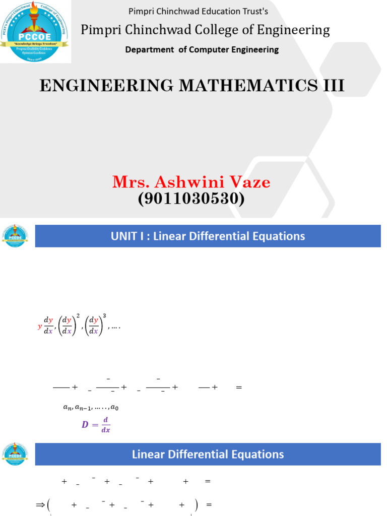 Case III : 𝜑 𝐷 = 𝐷 − 𝑚1 𝐷 − 𝑚2 and corresponding D.E. is 𝐷 − 𝑚1 𝐷 − 𝑚2 𝑦 = 𝑓 𝑥