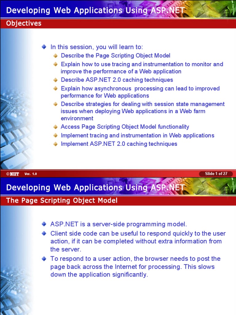 Describe the Page Scripting Object Model Explain how to use tracing and instrumentation to monitor and improve the performance of a Web application Describe ASP.NET 2.0 caching techniques Explain how asynchronous processing can lead to improved performance for Web applications Describe strategies for dealing with session state management issues when deploying Web applications in a Web farm environment Access Page Scripting Object Model functionality Implement tracing and instrumentation in Web applications Implement ASP.NET 2.0 caching techniques