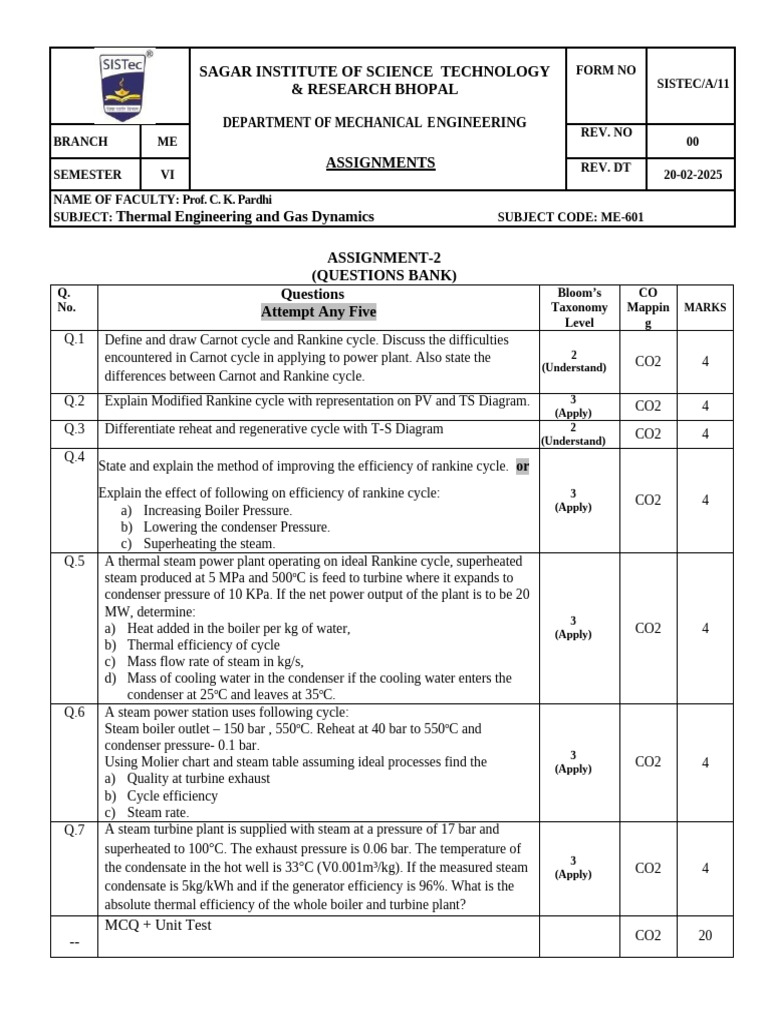 SUBJECT: Thermal Engineering and Gas Dynamics SUBJECT CODE: ME-601
