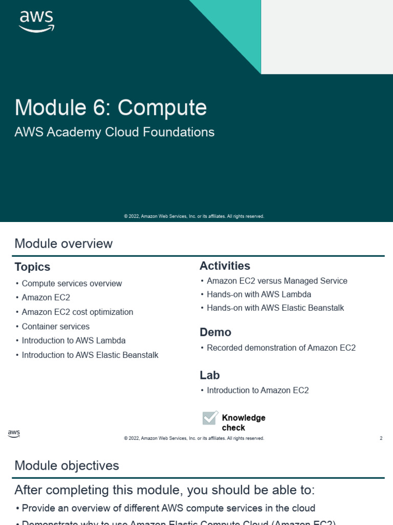 Amazon Web Services (AWS) offers many compute services. This module will discuss the