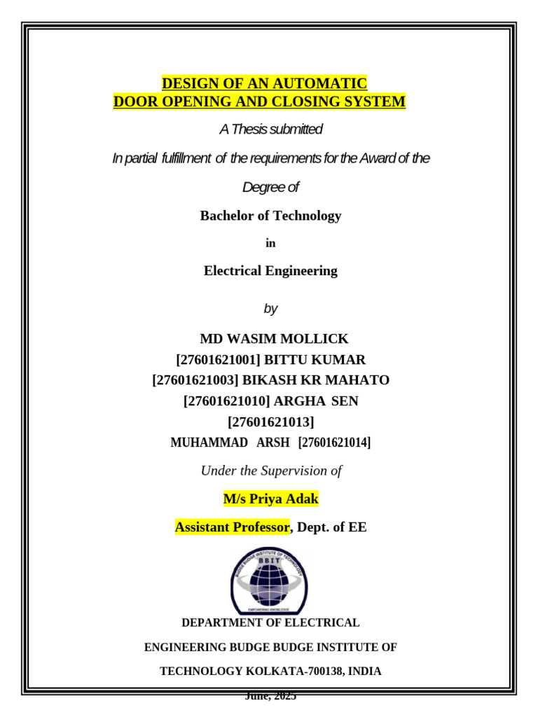 This thesis report entitled “Design of an Automatic Door Opening & Closing
