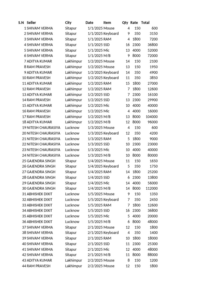 N Seller City Date Item Qty Rate Total
