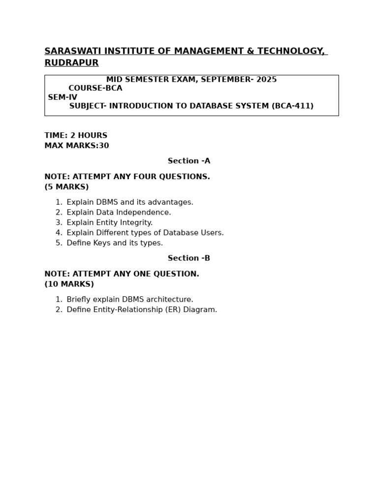 SUBJECT- INTRODUCTION TO DATABASE SYSTEM (BCA-411)