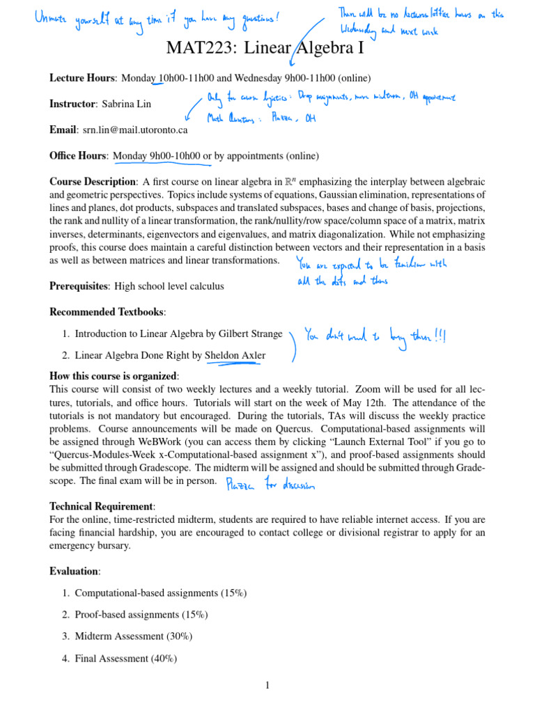 This course will consist of two weekly lectures and a weekly tutorial. Zoom will be used for all lec-