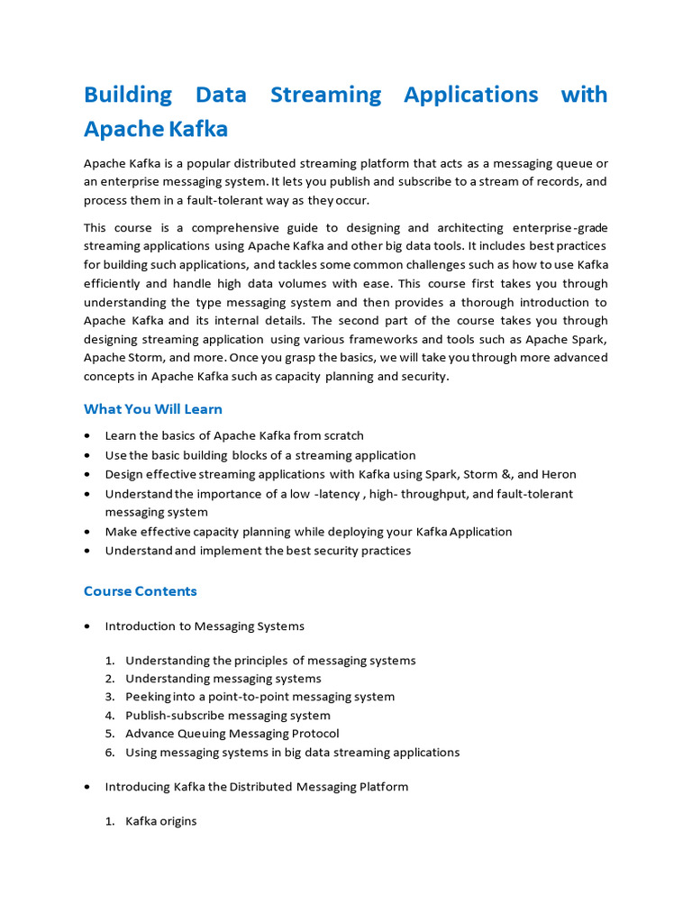 streaming applications using Apache Kafka and other big data tools. It includes best practices