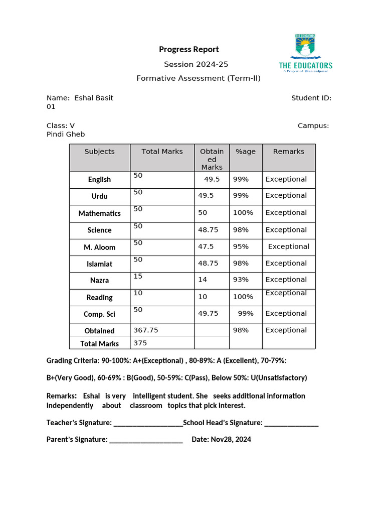 Remarks: Eshal is very intelligent student. She seeks additional information
