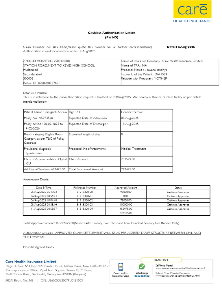 This is in reference to the pre-authorization request submitted on 03/Aug/2025. We hereby authorize cashless facility as per details