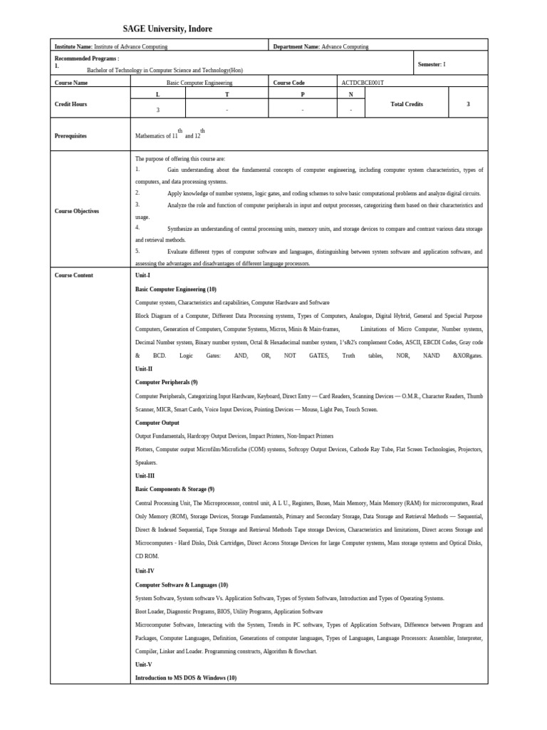 Course Name Basic Computer Engineering Course Code ACTDCBCE001T