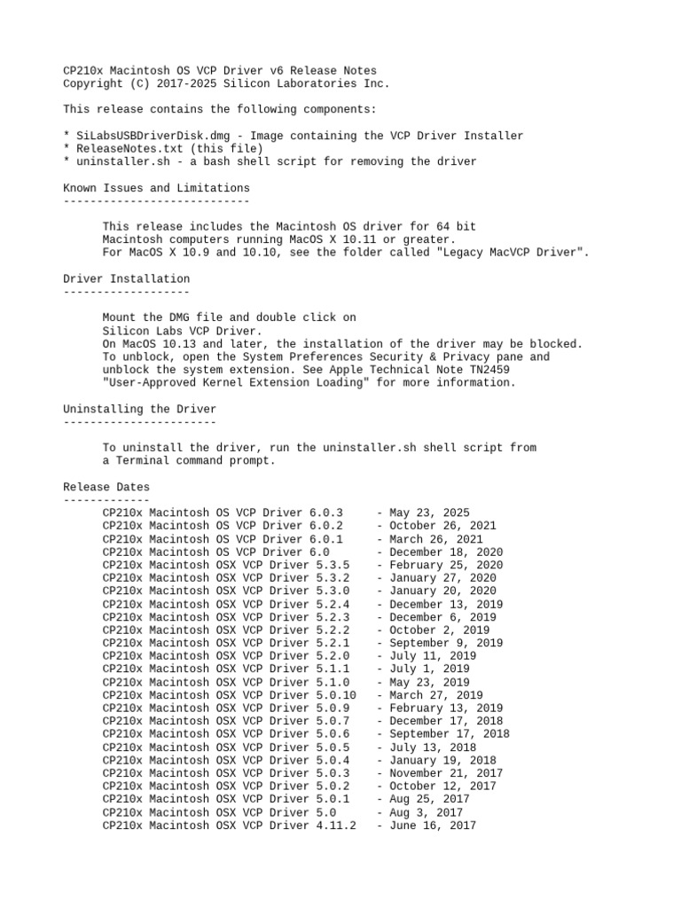 CP210x Macintosh OS VCP Driver 6.0.3 - May 23, 2025