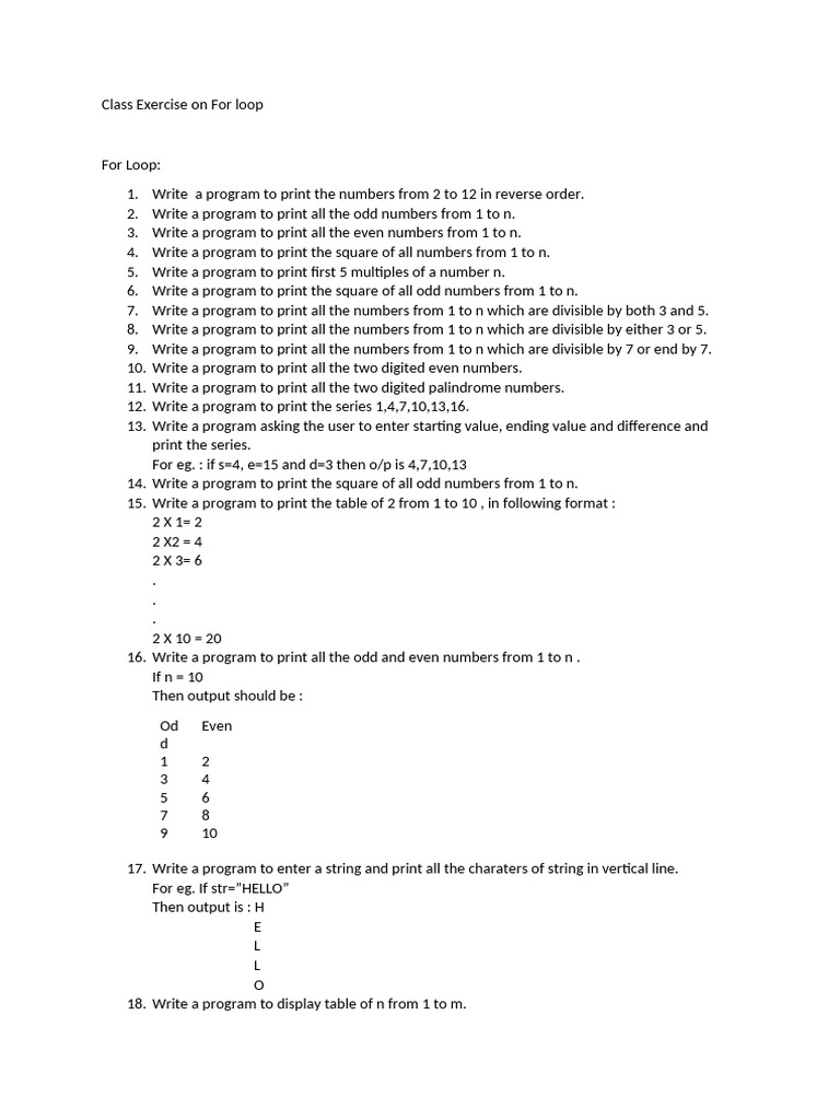 Class Exercise on For loop