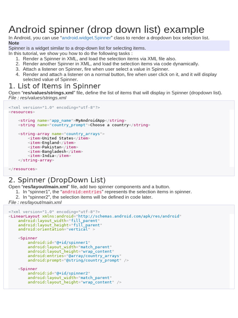Open “res/values/strings.xml” file, define the list of items that will display in Spinner (dropdown list).