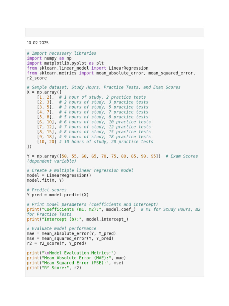 print("Coefficients (m1, m2):", model.coef_) # m1 for Study Hours, m2