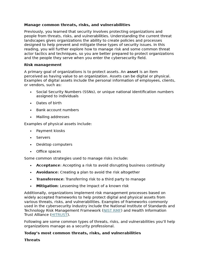 various threats, risks, and vulnerabilities. Examples of frameworks commonly