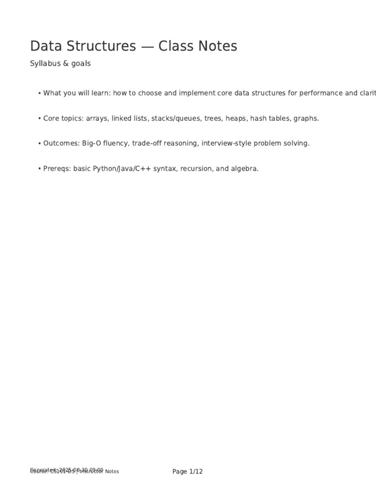 Core topics: arrays, linked lists, stacks/queues, trees, heaps, hash tables, graphs.