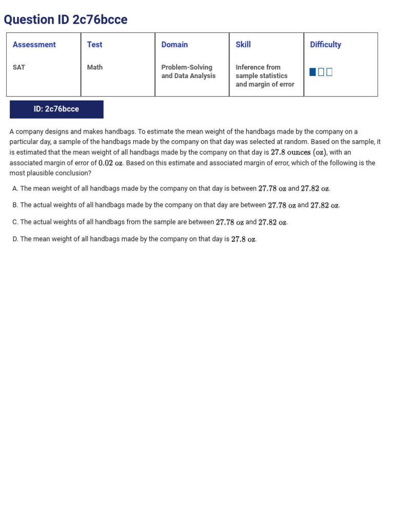 A company designs and makes handbags. To estimate the mean weight of the handbags made by the company on a