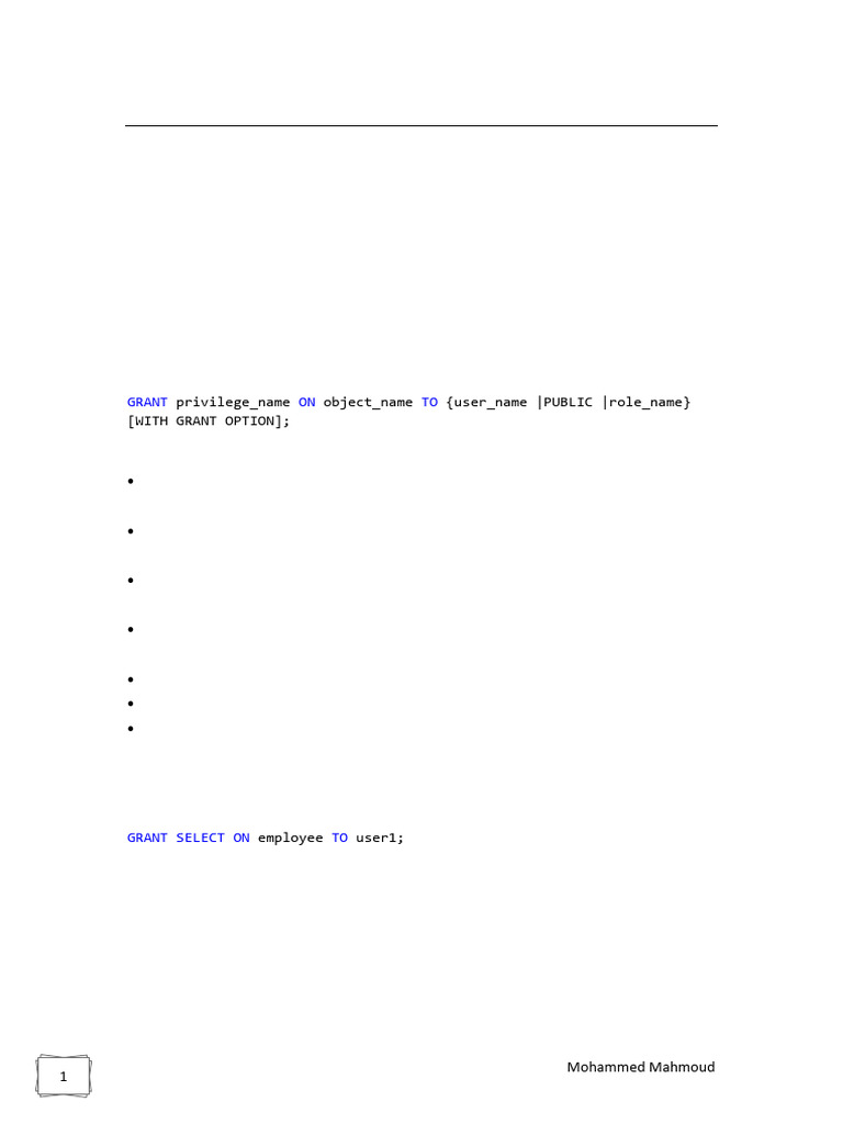 GRANT privilege_name ON object_name TO {user_name |PUBLIC |role_name}