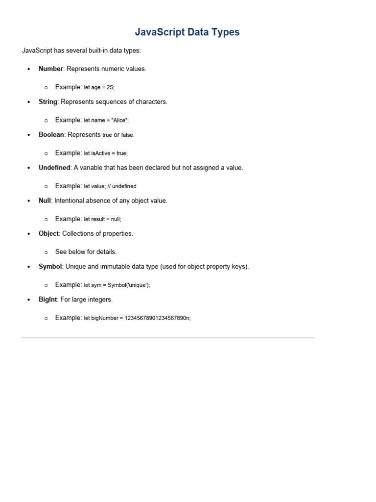 JavaScript has several built-in data types: