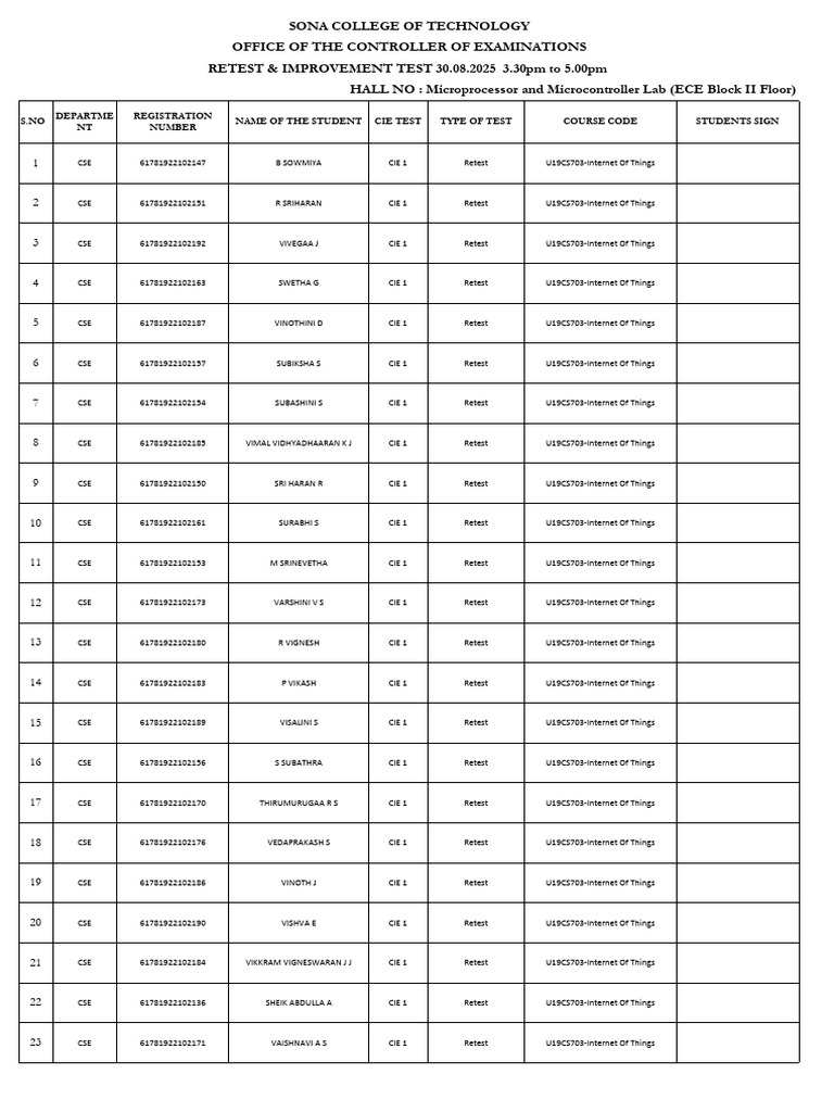 S.NO NAME OF THE STUDENT CIE TEST TYPE OF TEST COURSE CODE STUDENTS SIGN