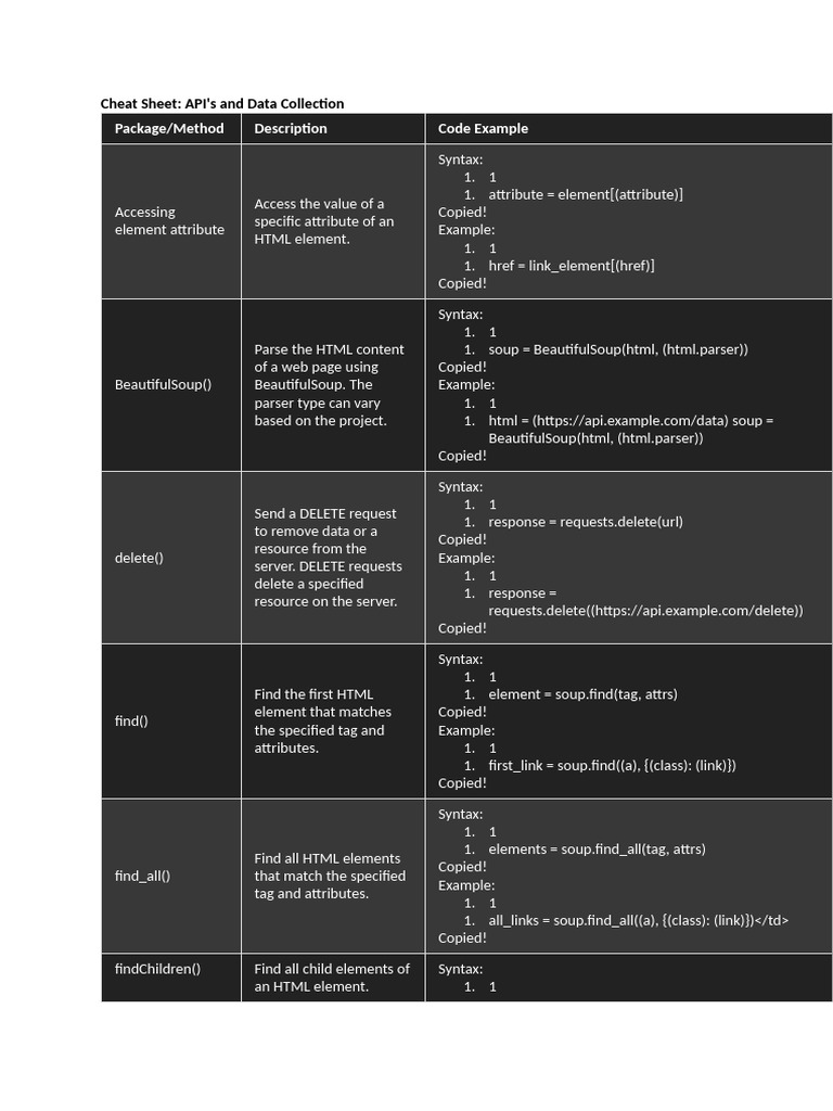 based on the project. 1. html = (https://api.example.com/data) soup =