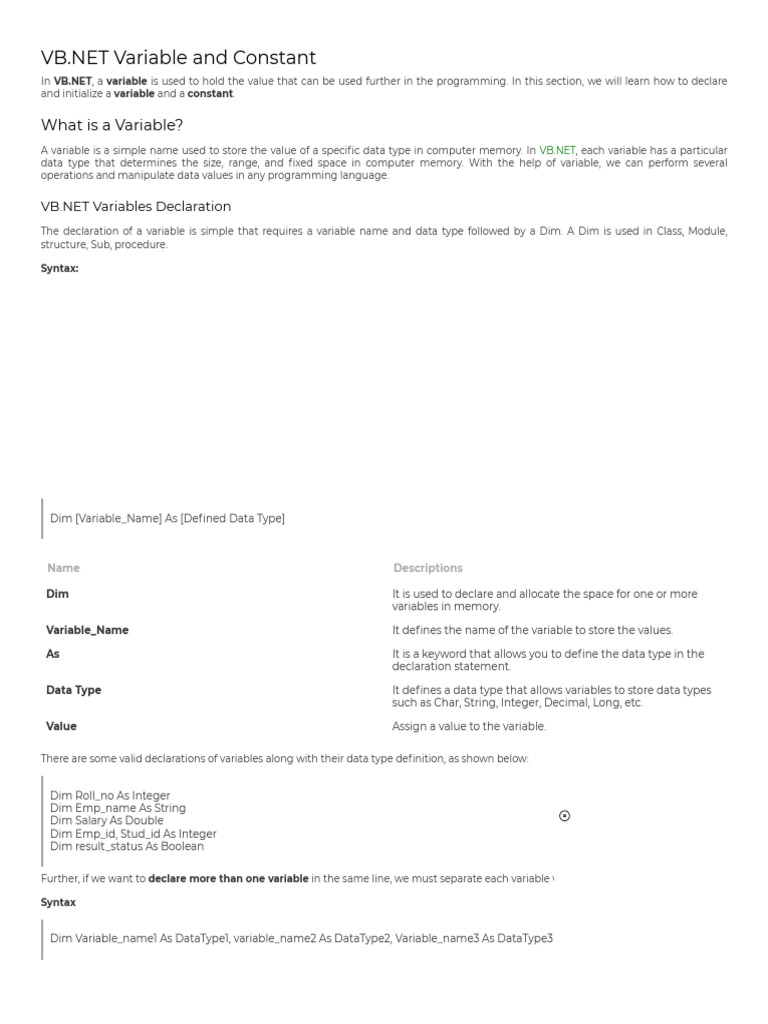 In VB.NET, a variable is used to hold the value that can be used further in the programming. In this section, we will learn how to declare